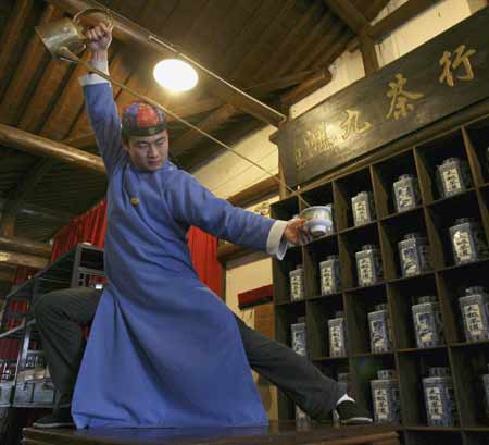 Updated: 2008-01-24 17:08 ![]() A waiter dressed in traditional Qing dynasty costume demonstrates pouring tea into a cup on the table at Taiji Tea House in Hangzhou, Zhejiang province January 23, 2008. China has a tea history of about 5,000 years. [Agencies]