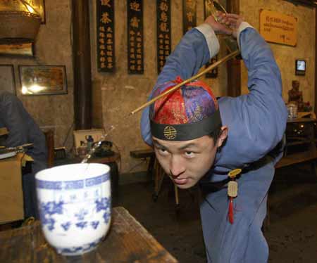 A waiter dressed in traditional Qing dynasty costume demonstrates pouring tea into a cup on the table at Taiji Tea House in Hangzhou, Zhejiang province January 23, 2008. China has a tea history of about 5,000 years. [Agencies]