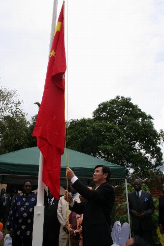 Assistant Foreign Minister Zhai Jun, a special envoy of President Hu Jintao, raises China's flag at the opening ceremony at the country's new embassy in Malawi on Saturday. [Xinhua]