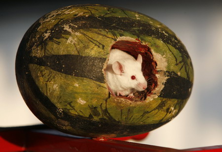 A rat belonging to animal trainer Guo Shutong looks out of a wooden carving shaped like a watermelon during a performance at the Acrobats World in Wuqiao, Hebei Province, January 29, 2008. Guo has been training rats since 1993 and performs stunts with five rats in a "rat city" made of small wooden houses connected with ropes. China will usher in the "Year of the Rat" on February 7, according to the lunar calendar. [Agencies]