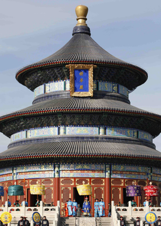 Updated: 2008-02-07 10:38 ![]() Chinese actors perform the ceremony of worshipping heaven at the Temple of Heaven in Beijing, February 6, 2008, during a cultural festival to celebrate the upcoming Chinese New Year. The ceremony of worshipping heaven was the most important national ceremony in ancient China held by the emperors of the Ming and Qing dynasties at the Temple of Heaven every year. [Agencies]
