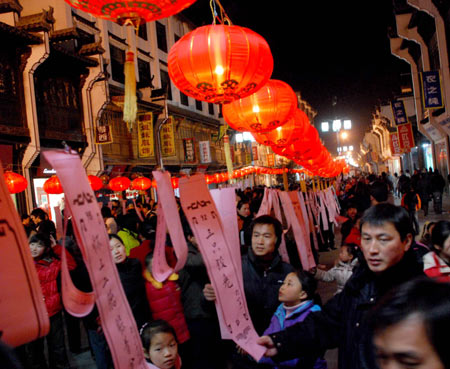 People guess hanged riddles at a pedestrian street in Ziyang Town of Wuyuan County, east China's Jiangxi Province, February 15, 2008. [Xinhua]