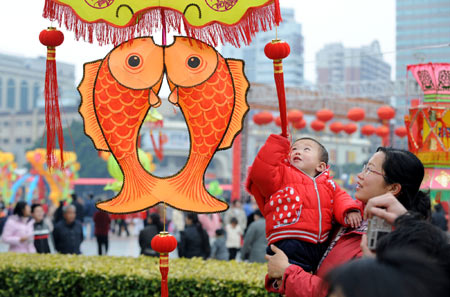 A woman with her baby in arms looks at a lantern displayed on a square in Fuzhou, capital of south China’s Fujian Province on February 16, 2008. [Xinhua]