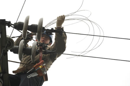A worker repairs a power line on a steel tower in Guiyang, capital of Southwest China's Guizhou Province, Feb. 17, 2008. Over 80 percent of the power lines and transformer substations damaged during the recent severe snow disaster in Guiyang have been recovered.[Xinhua]