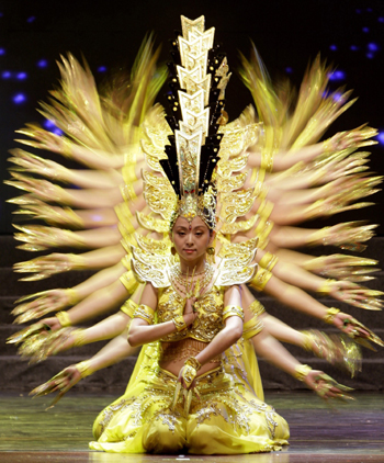 Tai Lihua, art director of China Disabled People's Performing Art Troupe, leads 20 deaf dancers in performing "Thousand-hand Avalokitesvara Bodhisattva", or "Guan Yin", a Chinese goddess, in Beijing February 19, 2008. [Agencies]