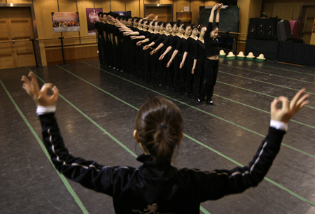 A gestural coach trains deaf dancers of China Disabled People's Performing Art Troupe to perform "Thousand-hand Avalokitesvara Bodhisattva", or "Guan Yin", a Chinese goddess, during a training in Beijing February 19, 2008. [Agencies]