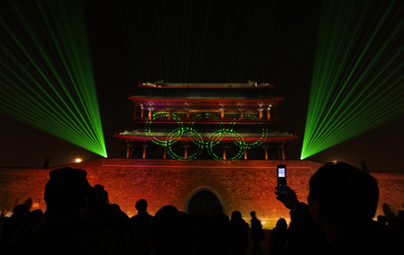 An Olympic logo is projected onto the Yongdingmen Gate which is lit by coloured lights to celebrate the Lantern Festival in Beijing February 21, 2008. [Agencies]