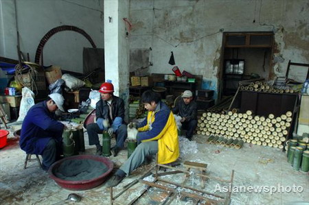 Local craftsmen stuff gunpowder into bamboo tubes which are used for the fire dragon dance at a workshop in Taijiang County, Southwest China's Guizhou Province, Feb 24, 2008. During the dance, the dragon is held up by several people while others spray fireworks at it, as local residents celebrate important festivals in Guizhou. [Asianewsphoto]