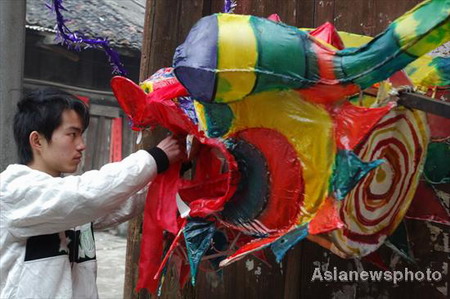 A craftsman checks the dragon's head at a workshop in Taijiang County, Southwest China's Guizhou Province, Feb. 24, 2008. The dance, in which people spray fireworks from bamboo tubes with gunpowder at the dragon's head and its holders, is warmly welcomed by local residents and tourists.[Asianewsphoto]