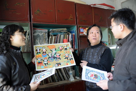 Farmer artist Ma Zengfu (C) shows his paintings to guests in his home in Qingguang Town, Tianjin Municipality on February 28, 2008. Ma was commissioned to create 80 paintings which will be presented to foreign visitors during the Beijing Olympics. [Xinhua]