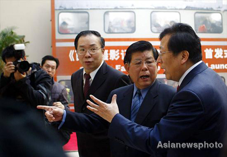 Party Secretary of China Federation of Literary and Art Circles Hu Zhenmin (center) and Vice-Minister of the State Council Information Office Wang Guoqing (left) display copies of Facing the Cold, a photo album on the people's fight against the recent sleet, at the release ceremony in Beijing yesterday. [Asianewsphoto]