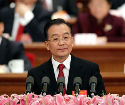 Premier Wen Jiabao delivers his government work report to the deputies to the First Session of the 11th National People's Congress at the Great Hall of the People in Beijing March 5, 2008. [asianewsphoto]