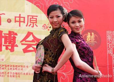 Models in traditional outfits pose at the Zhengzhou Wedding Industry Expo in Henan Province, Central China, March 8, 2008. Traditional outfits like cheong-sams and Tang Dynasty robes as well as wedding sedan chairs were highlights of the event. [Asianewsphoto]