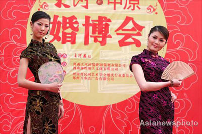 Models in traditional robes pose at the Zhengzhou Wedding Industry Expo in Henan Province, Central China, March 8, 2008. Traditional outfits like cheong-sams and Tang Dynasty robes as well as wedding sedan chairs were highlights of the event. [Asianewsphoto]
