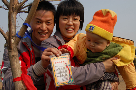 A couple holding their baby poses for a group photo in a tree-planting activity in Rizhao, East China's Shandong Province, March 11, 2008. [Xinhua]
