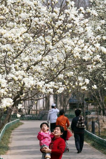 A woman and her child look at magnolia flowers while taking a walk in a park in Jinan of East China's Shandong Province March 17, 2008. [Xinhua]