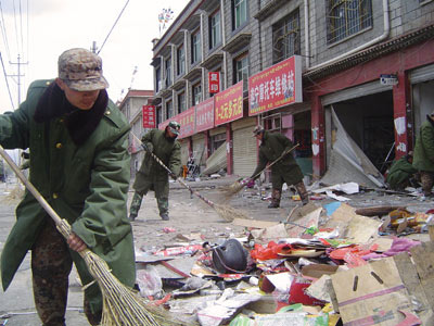 Armed policemen clean a street after a riot in Lhasa. [chinatibetnews.com]