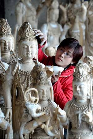 A female wood sculptor decorates the unfinished wood sculpture in the small village of Fengtai Town, Ninghe county in north China's Tianjin on March 23, 2008. [Xinhua]