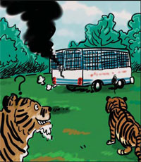 Park staff had to rescue the journalists in a tractor equipped with iron bars. The tigers were brought a live pig to distract them as the journalists swapped vehicles.