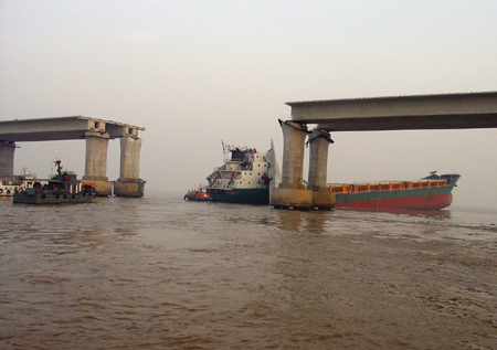 An empty cargo vessel (pictured) hits a bridge under construction near the eastern seaport of Ningbo, Zhejiang Province, March 27, 2008. Four crew members remain missing and 16 have been rescued so far. [Xinhua]
