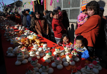 People look at creations made of dough at the Gonghui fair in Lanxian County, North China's Shanxi Province, March 26, 2008. Folk display their dough sculptures on a 200m-long shelf along the main street during the fair, to givethe public an opportunity to admire their creations.[Xinhua]