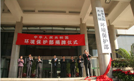Minister Zhou Shengxian (1st right) applauds with other officials at the unveiling ceremony of the Ministry of Environmental Protection in Beijing March 27, 2008. The ministry was elevated from the State Environmental Protection Administration as a "super ministry" in the government reshuffle plan adopted at the First Session of the 11th National People's Congress. [Mep.gov.cn]