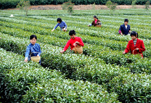 Tea growers pick spring tea leaves in Wuyuan County of East China's Jiangxi Province March 27, 2008. [Xinhua]