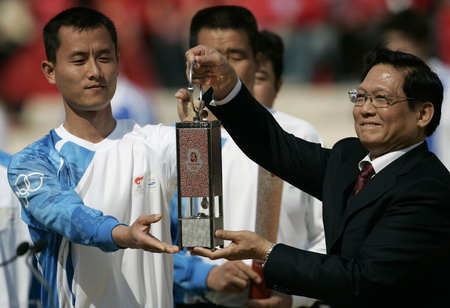 Beijing Olympic organizing committee president Liu Qi (R) holds the Olympic flame during the handover ceremony of the Beijing 2008 Olympic flame at Athen's Panathenian stadium in Athens March 30, 2008. [Agencies]