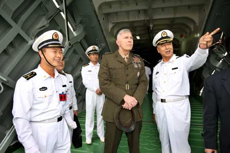 United States Marine Corps Commandant James Conway (2nd R) views a naval vessel of South China Sea Fleet in Zhanjiang, south China's Guangdong Province, April 2, 2008. [Xinhua]
