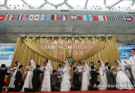 Seven couples attend a group wedding at the National Aquatic Centre or "Water Cube" in Beijing, April 26, 2008. Seven staff members of China Construction First Building (Group) Co. Ltd. have taken part in the construction work of the National Aquatic Centre and postponed their weddings several times because of the busy work schedule. After the construction work was completed, they attended a mass wedding ceremony at the place where they have worked. [Asianewsphoto]