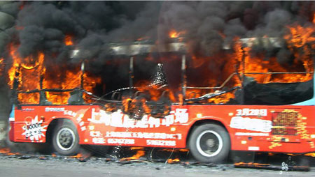 A bus is on fire after an expolsion in Shanghai, May 5, 2008. Three passengers were killed and 12 others injured in the incident. The cause of the explosion is still yet unknown. [xmnext.com]
