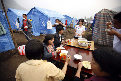 People eat breakfast together near their tents where they've been living after the May 12 earthquake in Shifang, Sichuan Province, May 24, 2008. [Xinhua]