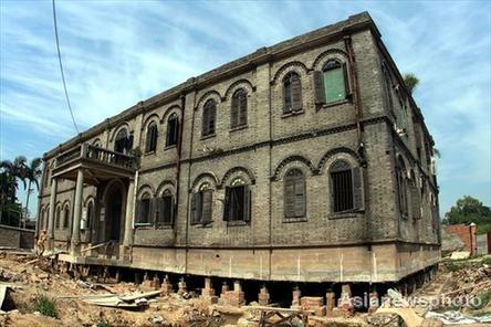 The Priest's House of Fanchuanpu Church is lifted up in preparation for relocation to its new site in Fuzhou city, east China's Fujian province July 3, 2008. It is lifted up over one meter high before being moved to make space for a newly planned road in the city. [Asianewsphoto]
