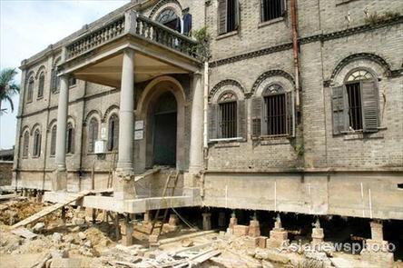 Built in 1933 with Gothic and French style, the Priest's House of Fanchuanpu Church is lifted over one meter high in preparation for relocation of the building, in Fuzhou, Fujiang Province, July 3, 2008. It has been placed under provincial protection as an important cultural relic. [Asianewsphoto]