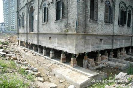 Priest's House of Fanchuanpu Church is lifted up over one meter high before being moved to a new site to make space for a newly planned road in Fuzhou city, east China's Fujian province July 3, 2008. [Asianewsphoto]