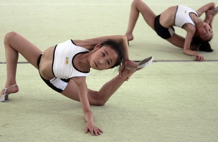 Young gymnasts practice rhythmic gymnastics during a training session at a sports school in Nanjing, Jiangsu province, July 7, 2008. China's future Olympic hopefuls train at thousands of provincial sports schools around the country. [Agencies]