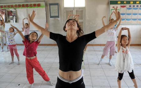 A teacher leads her students during a dance class at a residential community in Urumqi, Northwest China's Xinjiang Uyghur Autonomous Region, July 10, 2008. A performing troupe was founded in the community to train migrant workers' children in dancing free of charge. [Xinhua]