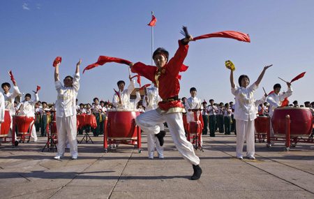 A dancer performs as young musicians from the Beijing 2008 Olympic Orchestra play music during a special concert prior to the Olympic Games at Tian'anmen Square in Beijing August 3, 2008. [Agencies]