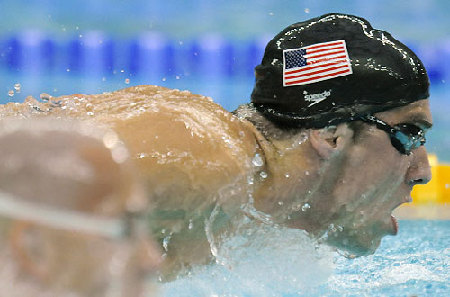 US swimmer Michael Phelps swims in the men's 400m individual medley swimming final at the National Aquatics Center during the 2008 Beijing Olympic Games on August 10, 2008 in Beijing. Phelps won in a time of 4:03.84. [Agencies]