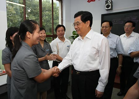 Chinese President Hu Jintao (C) shakes hands with a teacher as he visits a school for blind, deaf and dumb students in Zhengzhou, capital of central China's Henan Province, on Sept. 10, 2008, the 24th Teachers' Day of China. President Hu Jintao made an inspection tour in Henan Province from September 8 to 10, 2008. [Xinhua]