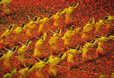 The program was divided into four parts, during which athletes and officials were showered with small red leaves and yellow petals; the red leaves conveying Beijing's love and respect for the athletes.