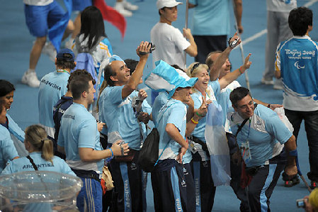 Members ofthe Argentine Paralympic delegation enter the National Stadium prior to the closing ceremony of the Beijing Paralympic Games, September 17, 2008. [Xinhua]
