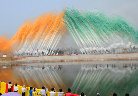 People watch a daytime firework display in Wanzai County, east China's Jiangxi Province on September 17, 2008. The 1st Fireworks Culture Festival kicks off in Wanzai, a major producer of fireworks. [Xinhua]