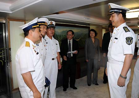 Updated: 2008-11-19 09:57 Yang Junfei (R), head of China's Dalian Naval Surface Warship Academy, meets with Vietnamese officers on Chinese naval training ship "Zheng He" at Tien Sa Port of Danang City, central Vietnam, on November 18, 2008. Chinese naval training ship "Zheng He" arrived at Tien Sa Port of Danang City on November 18 to start a five-day visit to Vietnam.[Xinhua]