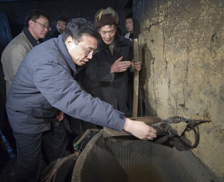 Li Keqiang (front), a member of the Standing Committee of the Political Bureau of the Central Committee of the Communist Party of China (CPC), checks the water faucet in a local villager’s house in Linshui County,Southwest China’s Sichuan Province, February 1, 2008. [Xinhua]