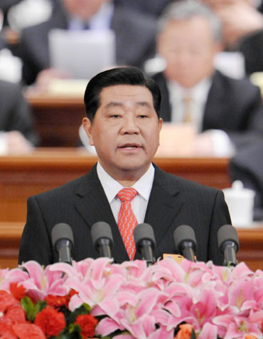 Jia Qinglin, chairman of the National Committee of the 10th National Committee of the Chinese People's Political Consultative Conference, delivers a work report to the First Session of the 11th National Committee of the CPPCC in the Great Hall of the People in Beijing March 3, 2008. [Xinhua]