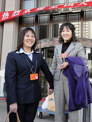 Hu Xiaoyan(L) and Zhu Xueqin, deputies of the National People's Congress (NPC), pose for photos in front of a hotel in Beijing, capital of China, March 3, 2008. [Xinhua]