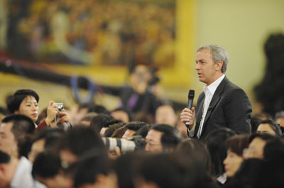 A foreign journalist raises a question to Chinese Foreign Minister Yang Jiechi during a press conference held on the sideline of the first session of the 11th National People's Congress in the Great Hall of the People in Beijing March 12, 2008. [Xinhua]