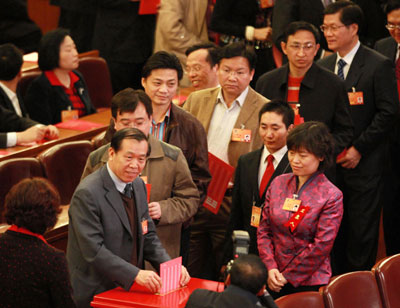 A CPPCC member casts his ballot at the fourth plenary meeting of the First Session of the 11th National Committee of the CPPCC at the Great Hall of the People in Beijing, March 13, 2008. New leadership, which includes chairperson, vice-chairpersons, secretary-general and Standing Committee members, will be elected at the meeting. [Xinhua]