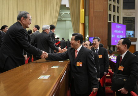 (Xinhua) Updated: 2008-03-13 20:14 ![]() Jia Qinglin (C) shakes hands with a delegate during the fourth plenary meeting of the Chinese People's Political Consultative Conference (CPPCC), after he was reelected chairman of the National Committee of the CPPCC, at the Great Hall of the People in Beijing March 13, 2008. [Xinhua]